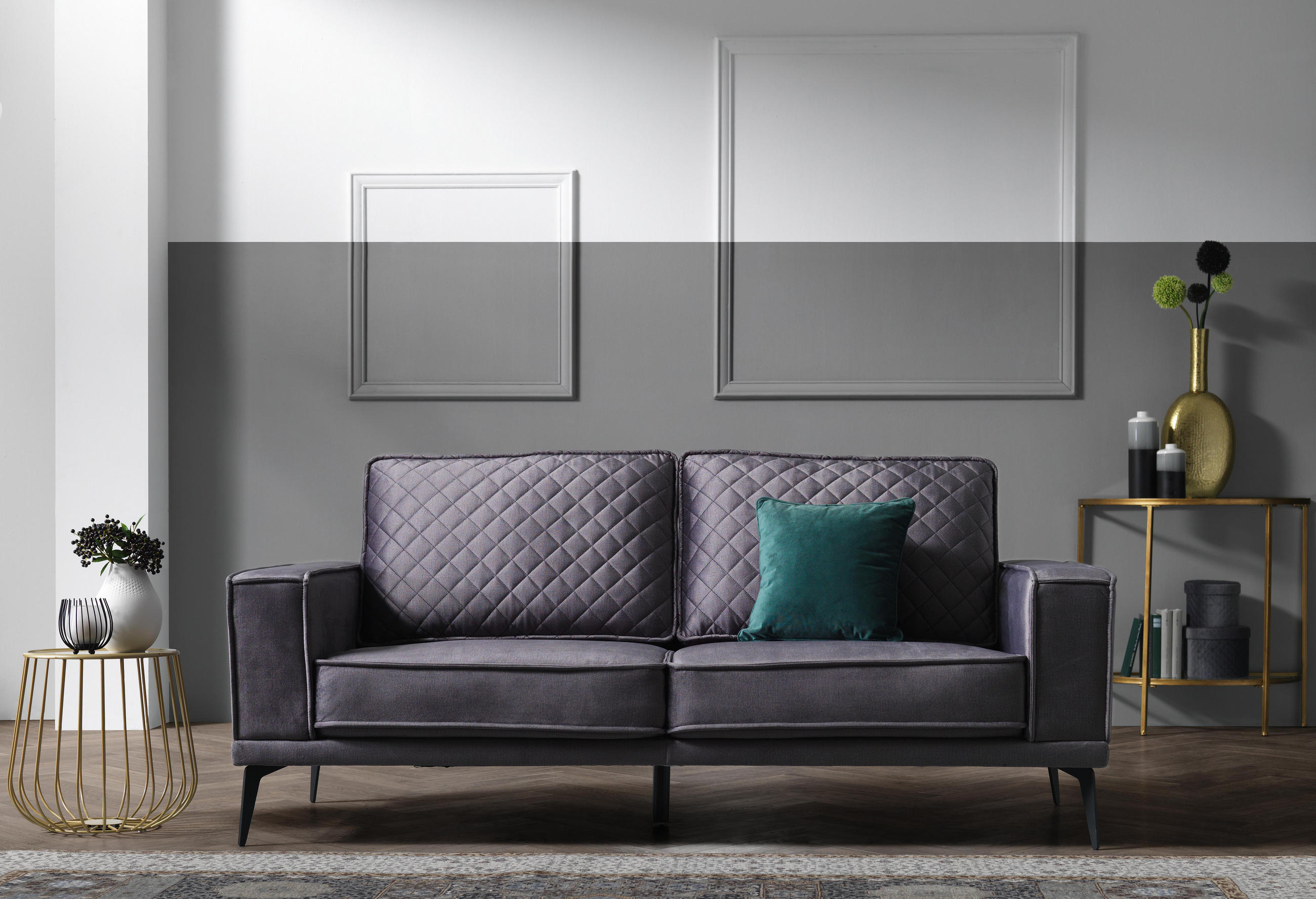 Dreisitzer Sofa Mit Samtbezug Grau Ansehen Wandgestaltung Metall Deko Wohnzimmer